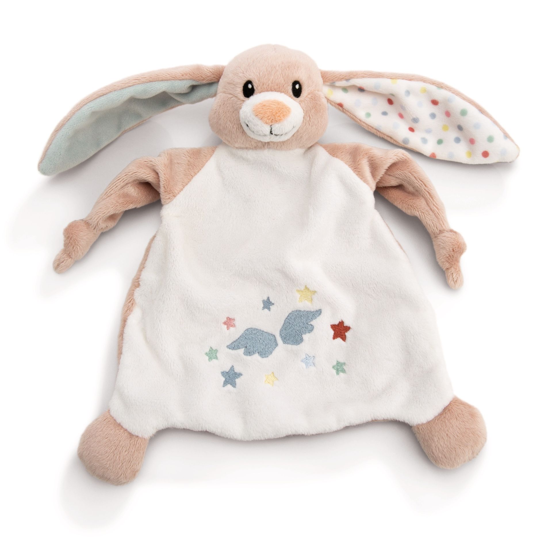 Das Schmusetuch Schutzengel Hase Fjella ist der perfekte Begleiter für die Kleinsten und spendet nicht nur Trost, sondern auch Geborgenheit. Aus babyweichem Plüsch gefertigt, lädt Fjella, ein hellbrauner Hase mit beigen Akzenten, zum Nuckeln, Kuscheln und Schmusen ein. Seine langen Schlappohren sind ideal zum Greifen und Entdecken – die Innenseiten sind in unterschiedlichen Farben gestaltet, was das Tuch besonders attraktiv macht und die Sinne des Babys anregt. Auf der Rückseite zieren kleine, flauschige Plüschapplikationen in Form von weißen Flügelchen Hase Fjella. Die Vorderseite ist mit bunten kleinen Flügelchen und Sternen verziert. Das Schmusetuch wird schnell zum unverzichtbaren Freund des Babys - ob beim Einschlafen, Spielen oder Unterwegs. Ein ideales Geschenk zur Geburt oder Taufe, das durch sein bezauberndes Design und seine Funktionalität besticht!